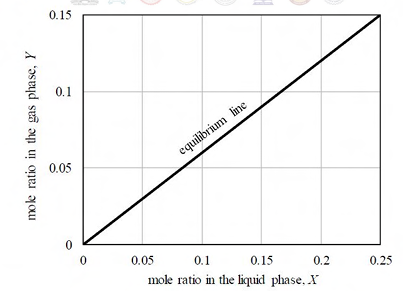 In a countercurrent stripping operation using pure steam, the mole ratio of a solute in the liquid stream is reduced from 0.25 to 0.05. The liquid feed flowrate, on a solute-free basis, is 3 mol/s. The equilibrium line for the system is given in the figure below. The MINIMUM flowrate of pure steam for this process, rounded to 1 decimal place, is