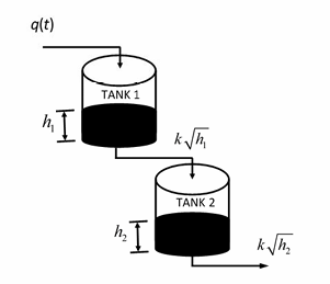 Consider two non-interacting tanks-in-series as shown in figure. Water enters TANK 1 at q cm3/s and drains down to TANK 2 by gravity at a rate k√h (cm3/s). Similarly, water drains from TANK 2 by gravity at a rate of k√h2 (cm3/s) where h1 and h2 represent levels of TANK 1 and TANK 2, respectively (see figure). Drain valve constant k = 4 cm2.5/s and cross-sectional areas of the two tanks are A1 = A2 = 28 cm2.