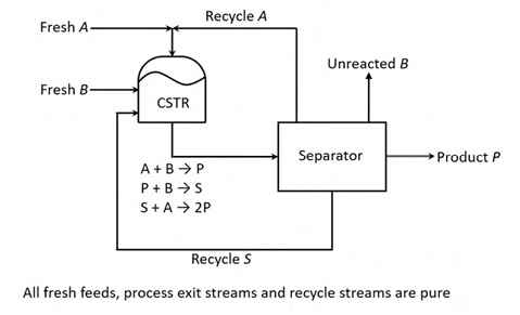 occur in the continuous stirred tank reactor (CSTR), where x is the mole fraction of the jth component (j = A, B, P, S) in the CSTR. It is given that k = k1. All process feed, process exit and recycle streams are pure. At steady state, the net generation rate of the undesired product, S, in the CSTR is zero. As q = xA / xB is varied at constant reactor temperature, the reactor volume is adjusted to maintain a constant single-pass conversion of B. For a fixed product rate and 90% conversion of B in the reactor, the value of q that minimizes the sum of the molar flow rates of the A and S recycle streams is ________ (round off to one decimal place).