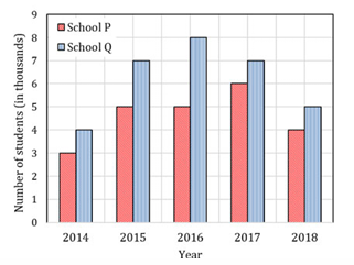 The following figure shows the data of students enrolled in 5 years (2014 to 2018) for two schools P and Q. During this period, the ratio of the average number of the students enrolled in school P to the average of the difference of the number of students enrolled in schools P and Q is