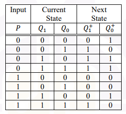 Consider a 2-bit saturating up/down counter that performs the saturating up count when the input P is 0, and the saturating down count when P is 1. The Next State table of the counter is as shown below. The counter is built as a synchronous sequential circuit using D flip-flops.