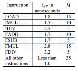 The EX stage of a pipelined processor performs the memory read operations for LOAD instructions, and the operations for the arithmetic and logic instructions. Let tEX denote the time taken by the EX stage to perform the operation for an instruction. For each instruction type, the values of tEX and M (the number of instructions of that type in a sequence of 100 instructions for a program P), are given in the table below.