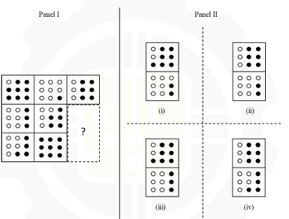 Two tiles are missing in Panel I. Which one of the options in Panel II is the appropriate choice for the missing tiles?