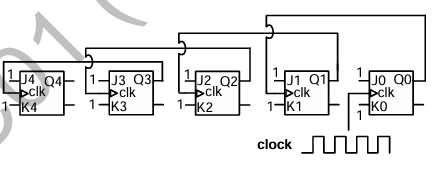 Five JK flip-flops are cascaded to form the circuit shown in Figure. Clock pulses at a frequency of 1 MHz are applied as shown. The frequency (in kHz) of the waveform at Q3 is __________ .