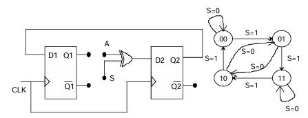 Suppose the XOR gate is replaced by an XNOR gate. Which one of the following options preserves the state diagram?
