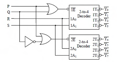 A 1-to-8 demultiplexer with data input Din, address inputs S0, S1, S2 (with S0 as the LSB) and Y0 to Y7 as the eight demultiplexed outputs, is to be designed using two 2-to-4 decoders (with enable input E and address inputs A0 and A1) as shown in the figure. Din, S0, S1 and S2 are to be connected to P, Q, R and S, but not necessarily in this order. The respective input connections to P, Q, R, and S terminals should be