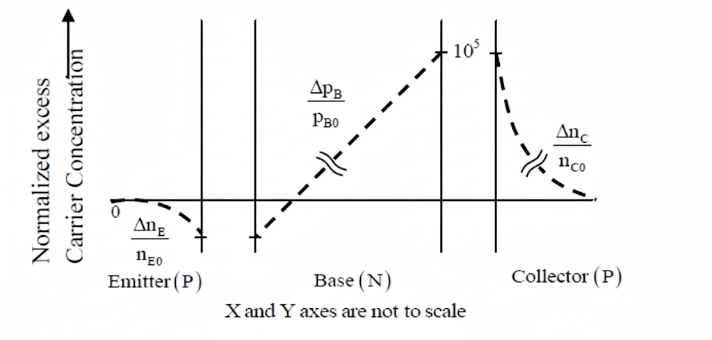 For a narrow base PNP BJT, the excess minority carrier concentrations (ΔnE for emitter. ΔpB for base. Δnc for collector) normalized to equilibrium minority carrier concentrations (nE0 for emitter, pB0 for base, nc0 for collector) in the quasi-neutral emitter, base and collector regions are shown below.