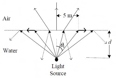 The permittivity of water at optical frequencies is 1.75ε0. It is found that an isotropic light source at a distance d under water forms an illuminated circular area of radius 5 m. as shown in the figure. The critical angle is θc.