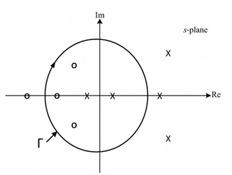 The pole-zero map of a rational function G(s) is shown below. When the closed contour ฮ is mapped into the G(s) -plane, then the mapping encircles