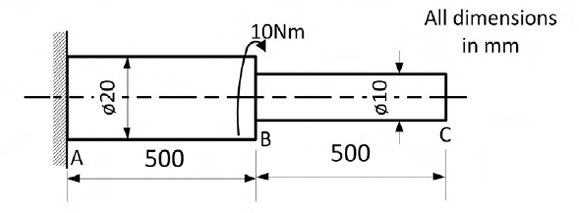 Consider a stepped shaft subjected to a twisting moment applied at B as shown in the figure. Assume shear modulus, G = 77 GPa. The angle of twist at C (in degrees) is ________.