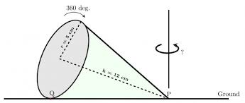 A right-angled cone (with base radius 5 cm and height 12 cm), as shown in the figure, is rolled on the ground keeping the point P fixed until the point Q (at the base of the cone, as shown) touches the ground again. By what angle (in radians) about P does the cone travel?