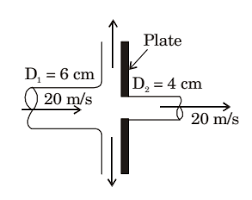 A 60 mm-diameter water jet strikes a plate containing a hole of 40 mm diameter as shown in the figure. Part of the jet passes through the hole horizontally, and the remaining is deflected vertically. The density of water is 1000 kg/m3. If velocities are as indicated in the figure, the magnitude of horizontal force (in N) required to hold the plate is ________.