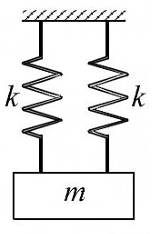A mass m is attached to two identical springs having spring constant k as shown in the figure. The natural frequency ω of this single degree of freedom system is