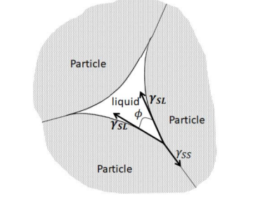 If the solid-solid interfacial energy (γSS) is 0.87 J⋅m⁻² and solid-liquid interfacial energy (γSL) is 0.5 J⋅m⁻², the dihedral angle (φ, in degree, rounded off to one decimal place) during sintering is _______.