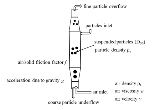 Assuming spherical particles, the diameter (D50) of the suspended particles which have 50% chance to report to overflow by turbulent air flow is expressed as _______.