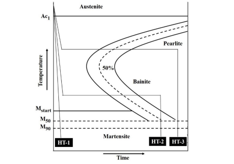 For the given schematic TTT diagram of an eutectoid steel, the following statement(s) is/are true for the heat treatment schedules HT-1, HT-2, and HT-3.
