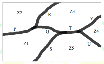 The diagram below shows a river system consisting of 7 segments, marked P, Q, R, S, T, U, and V. It splits the land into 5 zones, marked Z1, Z2, Z3, Z4, and Z5. We need to connect these zones using the least number of bridges. Out of the following options, which one is correct?