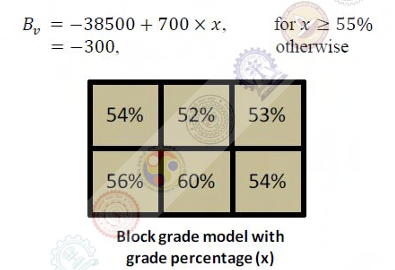 The block grade model of an ore deposit is shown in the figure below. The relationship between block value per tonne (Bv) in rupees and the block grade in percentage (x) is given below:
