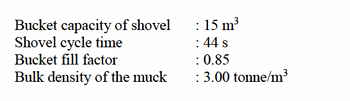 A shovel operates 300 days in a year, 2 shifts in a day, and 4 hours in a shift to achieve the target production of 30 Million tonne per annum. The following parameters relate to the loading operations: