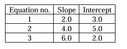The slope and intercept values of three linear equations are
