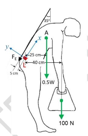 A mine worker weighing (W) 600 N lifts an object of 100 N as shown. The 50% body weight is applied downward through point A and a force FE is produced parallel to x axis by the contraction of erector spinae muscle during lifting. The lumber disc, L (shown by red box) acts as a smooth hinge and keeps the upper body in static equilibrium. Ignore all other forces in the body. The magnitude of the resultant of the reaction forces, in N at the lumber disc, is _________. (round off up to 2 decimals)