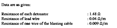 In a development coal face, 12 holes are drilled and charged with explosive. Holes are initiated with electric delay detonators connected in series. The length of a detonator lead wire is 1.5 m. The length of the blasting cable is 120 m.