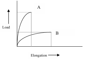 Given below are the load-elongation characteristics of two monofilament yarns A and B having the same denier and the work of rupture. Consider the following assertion [a] and reason [r].
