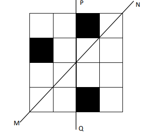 A line of symmetry is defined as a line that divides a figure into two parts in a way such that each part is a mirror image of the other part about that line. The given figure consists of 16 unit squares arranged as shown. In addition to the three black squares, what is the minimum number of squares that must be coloured black, such that both PQ and MN form lines of symmetry? (The figure is representative)